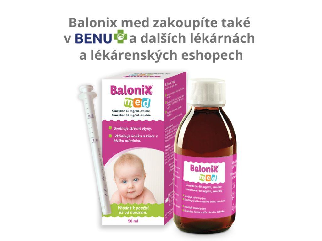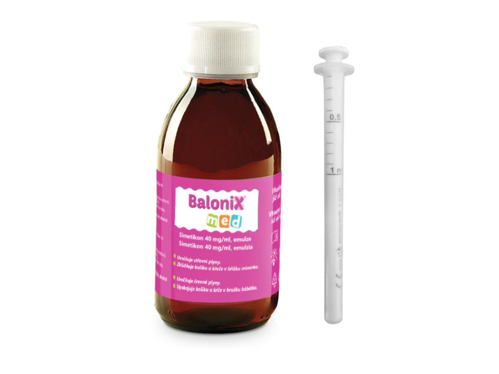 Zdravotnický prostředek Balonix med je určen k symptomatické léčbě potíží způsobených hromaděním plynů v bříšku miminek. Zmírňuje svíravou bolest bříška, kojeneckou koliku a větry, kterými miminka trpí v důsledku hromadění zachyceného vzduchu, tzv. prdíky. Simetikon, funkční složka Balonix med, mechanicky působí na plyny v trávícím ústrojí, rozruší povrch drobných bublinek plynu a umožní jejich spojení do větších bublin, které vaše dítě snadno vypustí jako větry. Simetikon není absorbován do těla, vychází z organismu nezměněn.